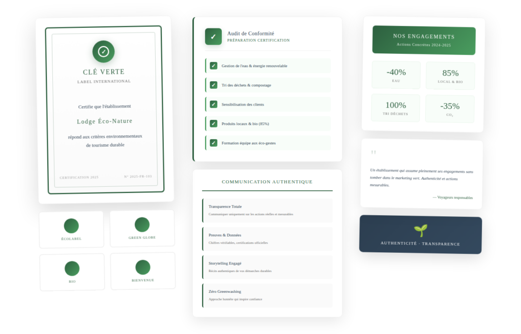Accompagnement aux certifications environnementales (Clé Verte, Écolabel), audit de conformité, stratégie de communication responsable, création de contenus authentiques. Nous vous aidons à communiquer vos engagements réels avec transparence, sans greenwashing.