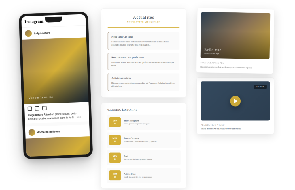 Stratégie de contenus, gestion de réseaux sociaux, création éditoriale régulière (newsletters, articles), production visuelle (photographie, vidéo, drone). Nous racontons votre histoire de façon vivante et régulière pour exister dans l’esprit de vos futurs clients.