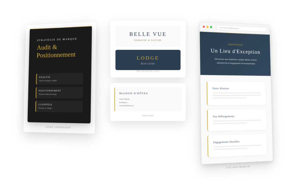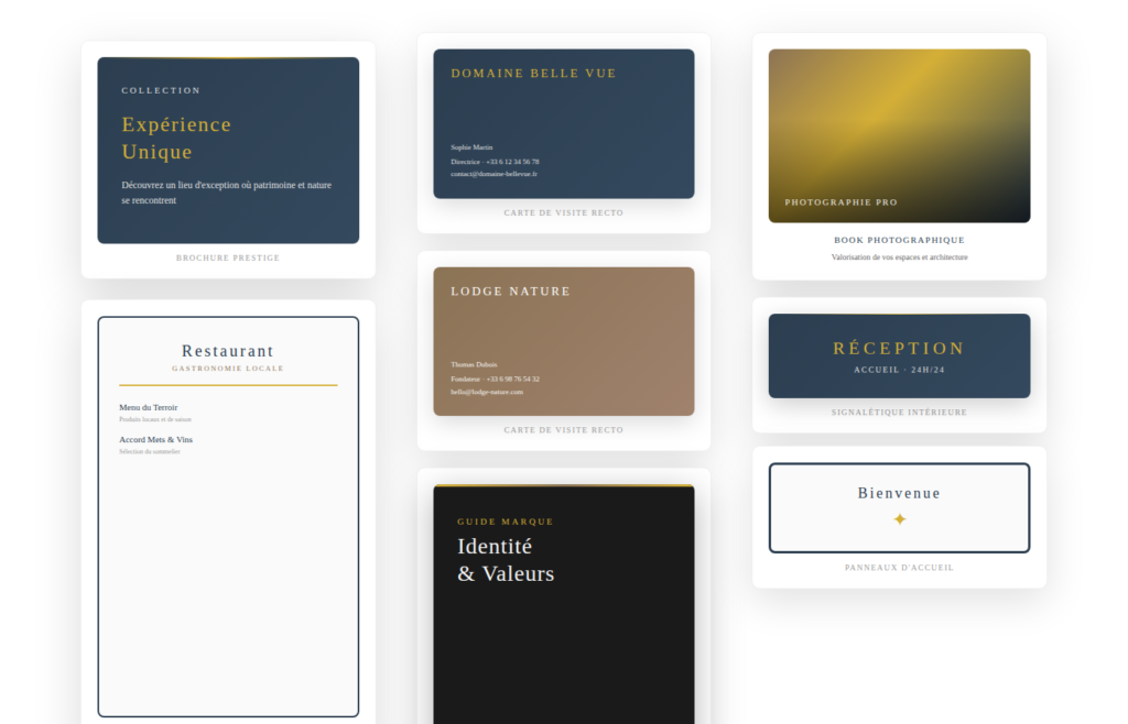 Refonte graphique, supports print premium (livres, brochures, cartes de visite, signalétique), book photographique professionnel, réécriture éditoriale. Nous élevons la qualité de tous vos points de contact pour qu’ils reflètent le standing réel de votre établissement.
